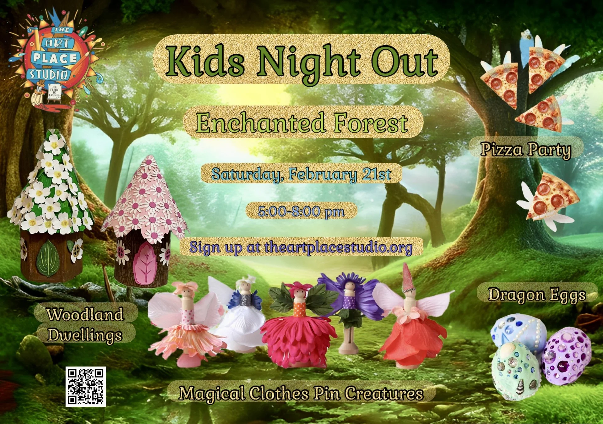Give your kids a fun night out at the studio where we will be immersed in magic and whimsy! Your kids’ imaginations will take flight as they create elements of their very own enchanted forest. They will create dragon eggs with clay and gems, construct woodland dwellings (like fairy houses or hobbit holes), and then bring their own unique magical creature to life. Or they can create freely with open art! The kids will enjoy pizza, juice and a veggie for dinner, play games and create with friends! It will be an enchanted evening in the studio!